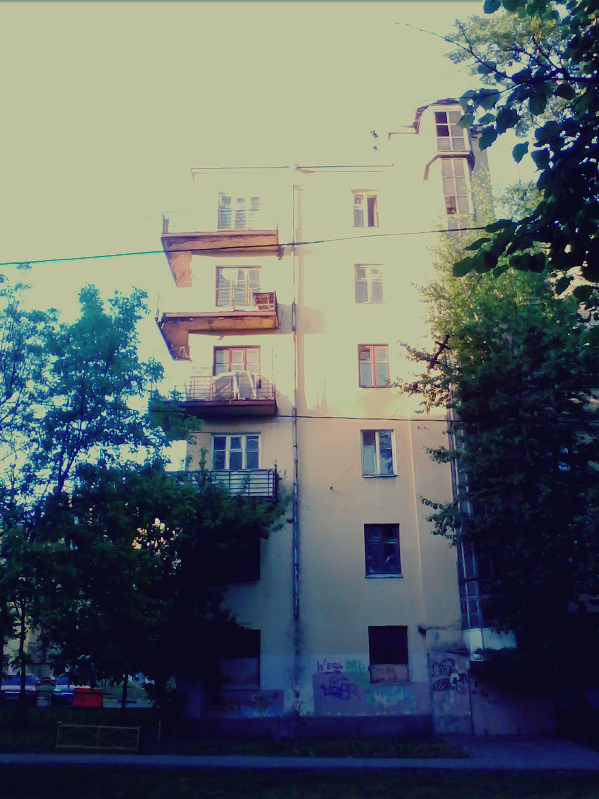 идится в нём, и других, выглядывающих позади, что-то знакомое, да это же настоящий рабочий городок, состоящий из пяти-шестиэтажных домов, построенный в стиле конструктивизма. На закатном солнце они как живые, яркие, с блестящими зеркальными шахтами лифтов, готовые ещё долгое время служить людям. На многих балконах цветы, и от одного взгляда на их становится тепло на душе. Всё здесь дышит умиротворением, и кажется, что находишься в маленьком подмосковном городке, затерявшемся во времени. А вот Боевским баням не повезло, и они, разрушенные и сгоревшие, навечно спрятались за широкой и длинной каменной стеной.