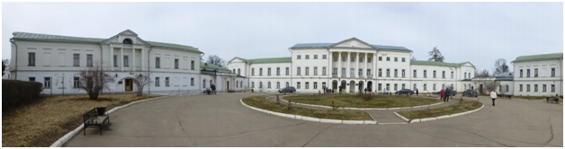 Дворец в Ивановском: правый флигель не влез полностью. Сейчас во дворце Музей профессионального образования, сохранился театральный зал, где игрались пьесы при Аграфене Фёдоровне, а сейчас устраиваются концерты. Есть зал, посвящённый хозяевам усадьбы, а последними были Бахрушины. Много залов, посвященных различным ремёслам. Очень сильное впечатление оставила экскурсовод: изящная эрудированная красавица с поставленным голосом, к сожалению, по рассеянности не записала её имени.