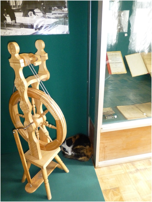 В углу возле прялки дремлет кошка по имени, естественно, Аграфена. Из почтения к возрасту и заслугам никто не рашается её беспокоить, поэтому, ни на кого не обращая внимания, спит и ещё круче свёртывается в крендель. Или калач? Самый впечатляющий аккорд, на мой взгляд, сделан нашим впечатляющим экскурсоводом в финале в помещении восстановленной домовой церкви, сама церковь не восстановлена, а расположилась здесь экспозиция, посвящённая создателям Азбуки Кириллу и Мефодию – не пропустите, это послание нужно услышать.